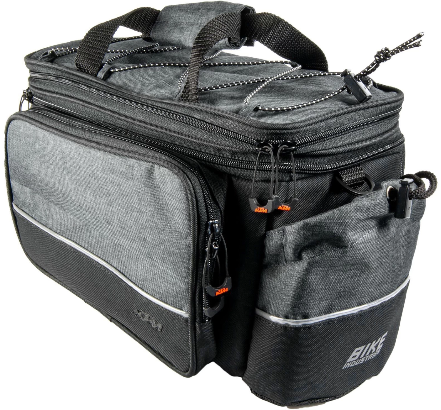 Dieser sportliche Alltagsbegleiter besitzt ein großes Hauptfach, wo sie die innere Aufteilung individuell variieren können. Durch einen zweiten Reißverschluss kann das Hauptfach nochmal etwas erweitert werden, wenn mal etwas Übergepäck an Bord sein sollte. Des Weiteren befindet sich ein Trinkflaschenfach sowie zwei Außentaschen mit Reißverschluss an den Außenseiten. Auf dem Dach der KTM Gepäckträgertasche ist ein Spanngurt mit Befestigungsösen, der es ihnen erlaubt zusätzliche Gepäckstücke einzuspannen.