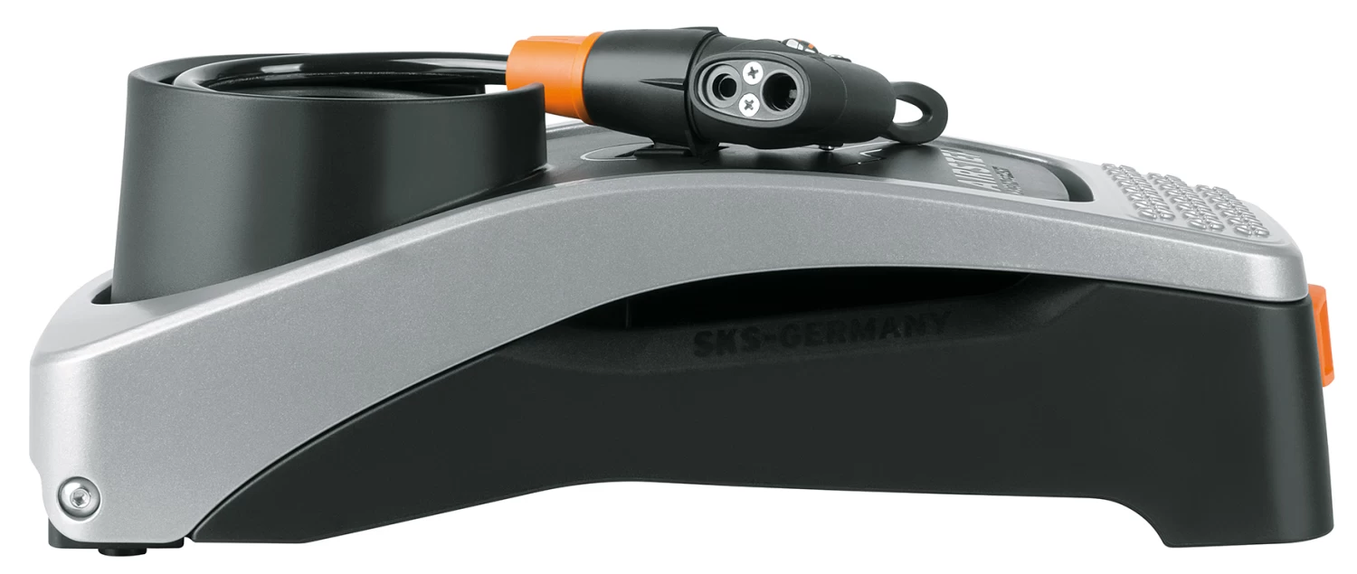 Die SKS Airstep Fußpumpe ist der ideale Partner für E-Bikes und kommt mit einem hochwertigen Präzisionsmanometer sowie Multivalve Ventilanschluss daher. Mit dem Airstep Tretbügel ist ein bequemes als auch ergonomisches pumpen möglich, wobei ein max. Druck von 7 bar / 102 PSI erzeugt werden kann. Das mittig angebrachte Manometer zeigt einem wieviel Bar sich aktuell im Schlauch befindet. Durch den Multivalve Ventilanschluss können Schläuche mit Sclaverand Presta, Dunlop oder Auto Schrader Ventile problemlos aufgepumpt werden. Der speziell pulverbeschichtete Aluminium Tretbügel bietet eine hohe Standfestigkeit beim pumpen und ist zudem kratzfest. Bei nicht Benutzung kann der Tretbügel mittels Verriegelung fixiert werden, sodass die Standpumpe wenig Stauraum benötigt.